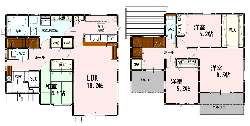 間取内容 LDK 18.2畳 1階  和室 4.5畳 1階  洋室 8.5畳 2階  洋室 5.2畳 2階  洋室 5.2畳 2階